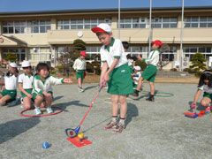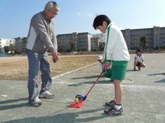 この日の実技講習は、日本スナッグゴルフ協会の小澤佳夫専務理事が講師を務め、前 半はやさしく丁寧に基礎を指導、後半は校庭に特設された4ホールのコースを実戦プ レーした。