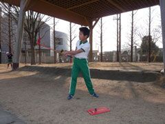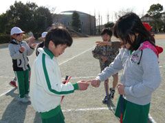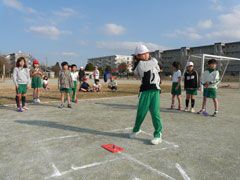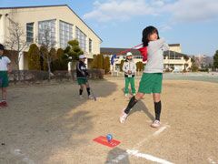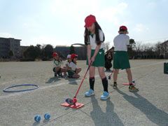 春が待ち遠しい冬晴れの校庭で、元気な小学3年生35名が、スナッグゴルフを学ん だ。