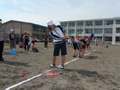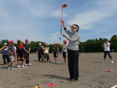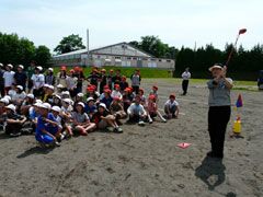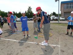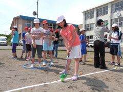 夏の日差しが眩しい、北広島市立北の台小学校の校庭で、6年生60名が参加してのス ナッグゴルフ実技講習会が行われた。