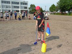 小泉プロとの対戦に立候補したのは、5月から北広島市総合体育館屋外ゴロッケー場 で始まったスナッグゴルフ練習会に参加している、たくみくん。