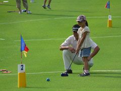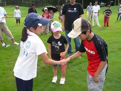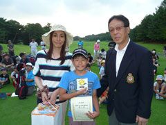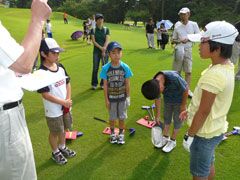 この大会は、「豊かな自然の中で遊び、ゴルフを通じた青少年の健全育成と、親子の 会話・絆を深めることにより、明るく豊かな街づくりに寄与することを目指す。」と いう主旨による、親子大会で、一打目は児童が、2打目以降は交互にボールを打って 競い合った。