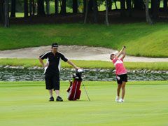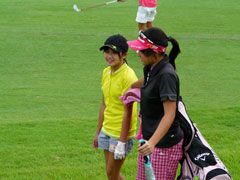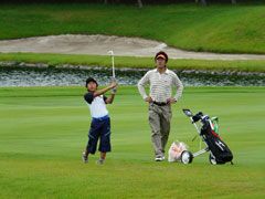 お父さんと兄とで参加した笹井愛子ちゃんは、ゴルフを始めて間もない4年生。前半 はお父さんがキャディを務めたが、後半からは兄の孝祐くんにバトンタッチ。 林からの脱出では、「7番アイアンでフェースをかぶせ、大振りせずに低めに打っ て」との的確なアドバイスで、見事にフェアウェイに戻してリカバリー。ベストスコ アでホールアウトした。