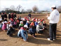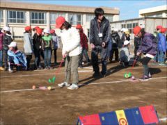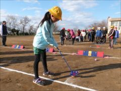 千葉県の八街市立笹引小学校で、スナッグゴルフ実技講習会が行われ、3年生から5年 生までの113人の児童が参加した。 冬至が目前に迫る校庭は、厳しい寒さではあったが、太陽の日差しと子どもたちの熱 気もあり、にぎやかな実技講習会となった。