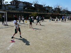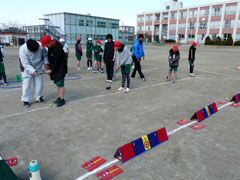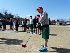 冷たい風の吹く冬晴れの運動場で、5年生90名がスナッグゴルフを体験し、パット、 チップショット、フルショットなどの基本練習を行い、初めてのゴルフを楽しんだ。