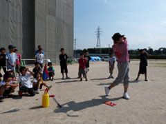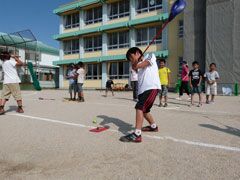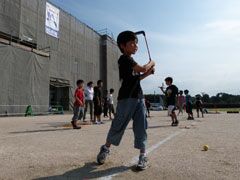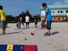 初夏の晴天の校庭で、スナッグゴルフを初めて体験する26名の児童たちが、地元の境港市在住の、野津一美プロの指導による実技講習会に参加し、クラブ活動の時間をニュースポーツで楽しんだ。