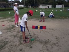 津市立戸木(へき)小学校の校庭で、クラブ活動の時間にスナッグゴルフが行われ、4 年生から6年生までの16人が参加して、戸軽明美プロの指導により、ゴルフの基礎を 学んだ。