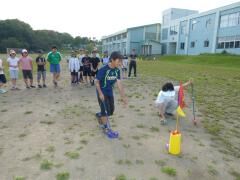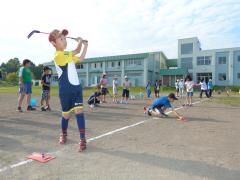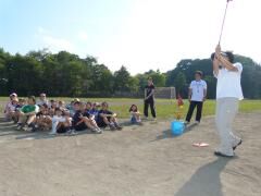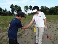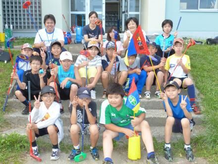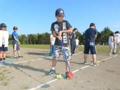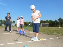昨年の年末にスナッグゴルフを導入した北広島市立双葉小学校にて、屋外スポーツク ラブを選択している19名の児童を対象とした、スナッグゴルフ実技講習会が行われ、 残暑の日差しが眩しい校庭で、子どもたちは楽しい時間を過ごした。