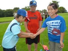 競技は、札幌北広島GC特有の、アンジュレーションのあるフェアウェイのためか、 パッティングに手こずる選手が多かったが、前年度総合優勝者で西部小学校6年の粂 地純弥くんと、東部小学校6年の池田夕太郎くんが、同ストロークでホールアウト し、大会初のプレーオフ決戦にもつれ込んだ。