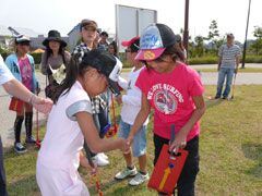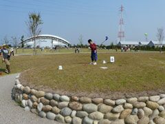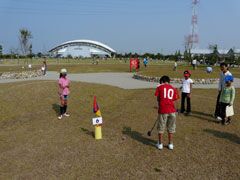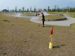 今回は公園のグランドオープン後もあって、広大な敷地内に想像力をかきたてるホールがレイアウトされ、特に5番ホールと6番ホールは、テレビゲームのような高台からの豪快な打ち下ろしのパー4と、こんもりしたマウンド越えの力加減を必要とするパー3が好評で、ティグラウンドに立った子どもたちは一往に「すげぇー。なんだこりゃー。」と驚きとワクワクで進んでいった。