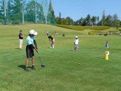 大会は、小学生と親または祖父母などがペアを組み、1つのボールを交互に打つ方法 で行われ、秋晴れの爽やかな気候のもとで、35組のペアが9ホールを楽しくプレーし た。