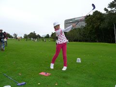 この日も、表彰式までの合間を利用して、ゴルフの醍醐味を感じてもらおうと、練習 場に移動して吉竹正典プロによる即席デモショットが披露され、スナッグゴルフから ゴルフへステップアップする道筋についてもイメージできるような時間が提供され た。