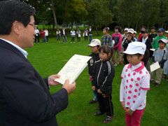 総合優勝をして、札幌北広島GCカップを手にした、西部小学校5年の粂地純弥くんは 表彰式で、「優勝できるとは思っていませんでしたが嬉しい。来年も出場したいで す。」とスピーチし、拍手の祝福を受けた。続いて「連覇を狙いますか?」との質問 には、「それはわかりません。」と照れくさそうに答えた。