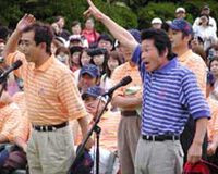 東西両チームを代表して栗田貫一さん、間寛平さんの、まるで掛け合い漫才のような 楽しい選手宣誓(=写真上)のあと、いよいよ本番。たちまち、心臓の鼓動が高鳴る 仲間さんに、選手たちから口々に声援が飛ぶ。