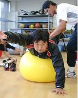 バランスボールを使ったトレーニングに励む片山を、白木氏(=右)がサポート