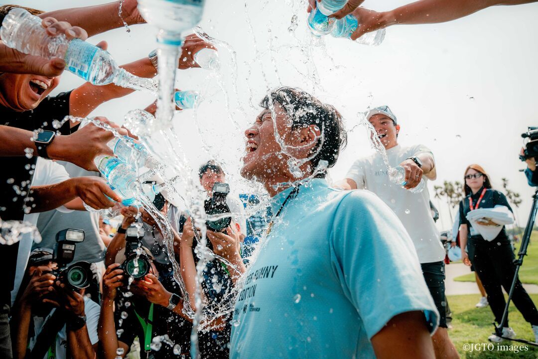 先輩・後輩、国問わず、いつも率先して仲間を祝福してきた。自分がどんなに悔しい時でも必ず相手を称え続けてきた選手が、いま水シャワーの渦中にいる。