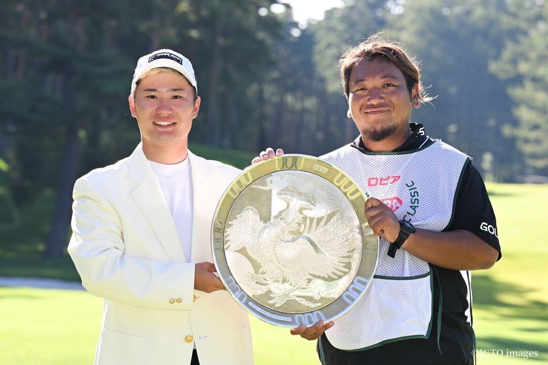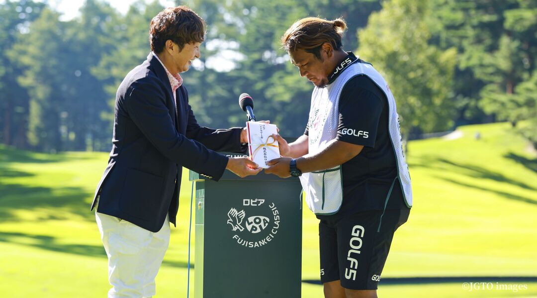 完全優勝の快挙を支えた山本凌平キャディには、「ロピア・ベストサポート賞」として、54ホールの競技短縮により75%となったV賞金の10%にあたる165万円が贈られた。