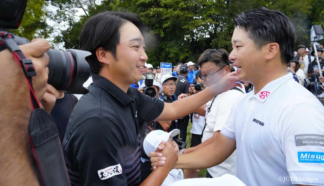 グリーンサイドに並んで腰かけ、勝俣のプレーを見届けると、恒例の水シャワーで初優勝を祝福していた。