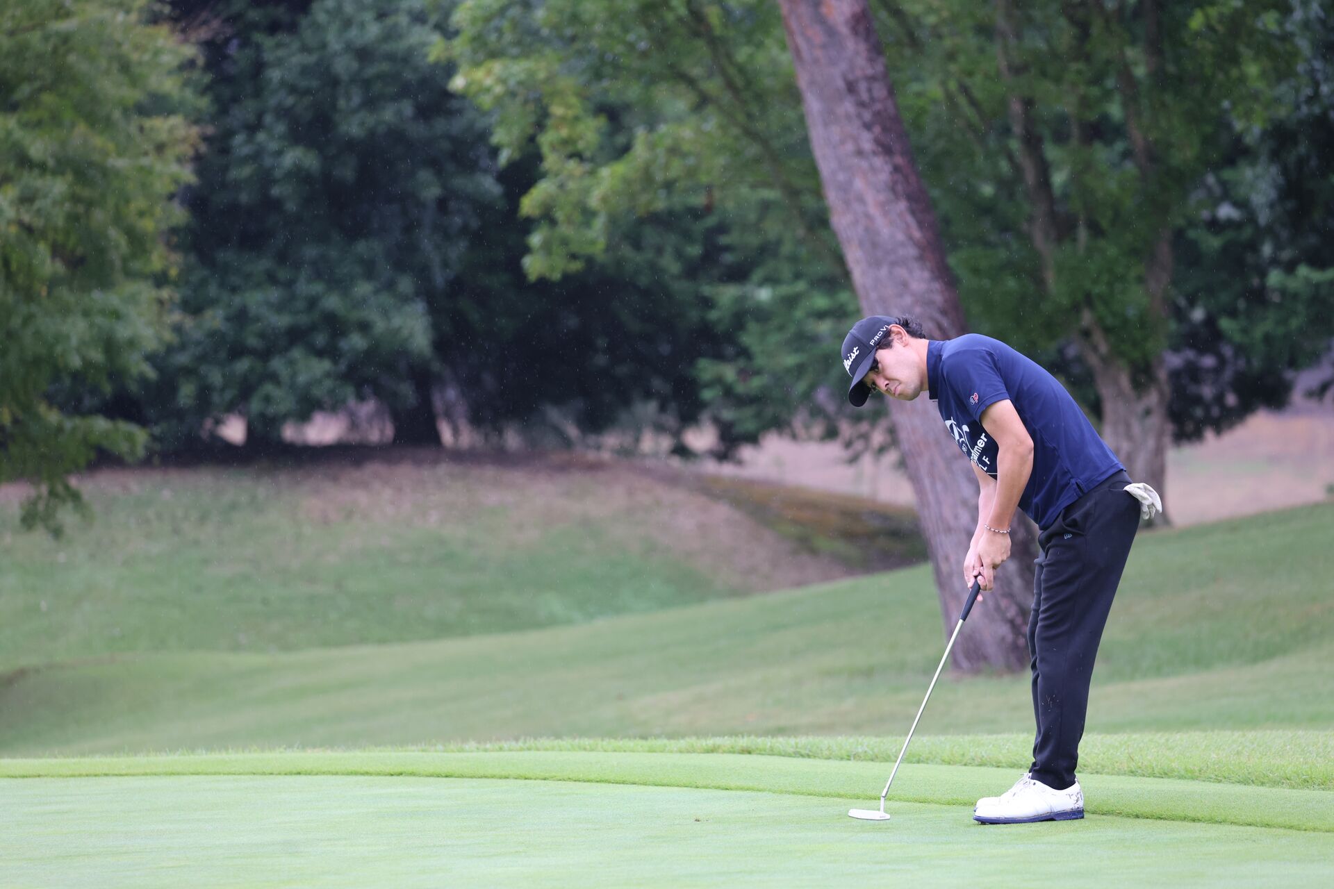 冷たい雨が降りしきる中、8バーディ、1ボギーの64をマークし、単独首位に立った加藤龍太郎。