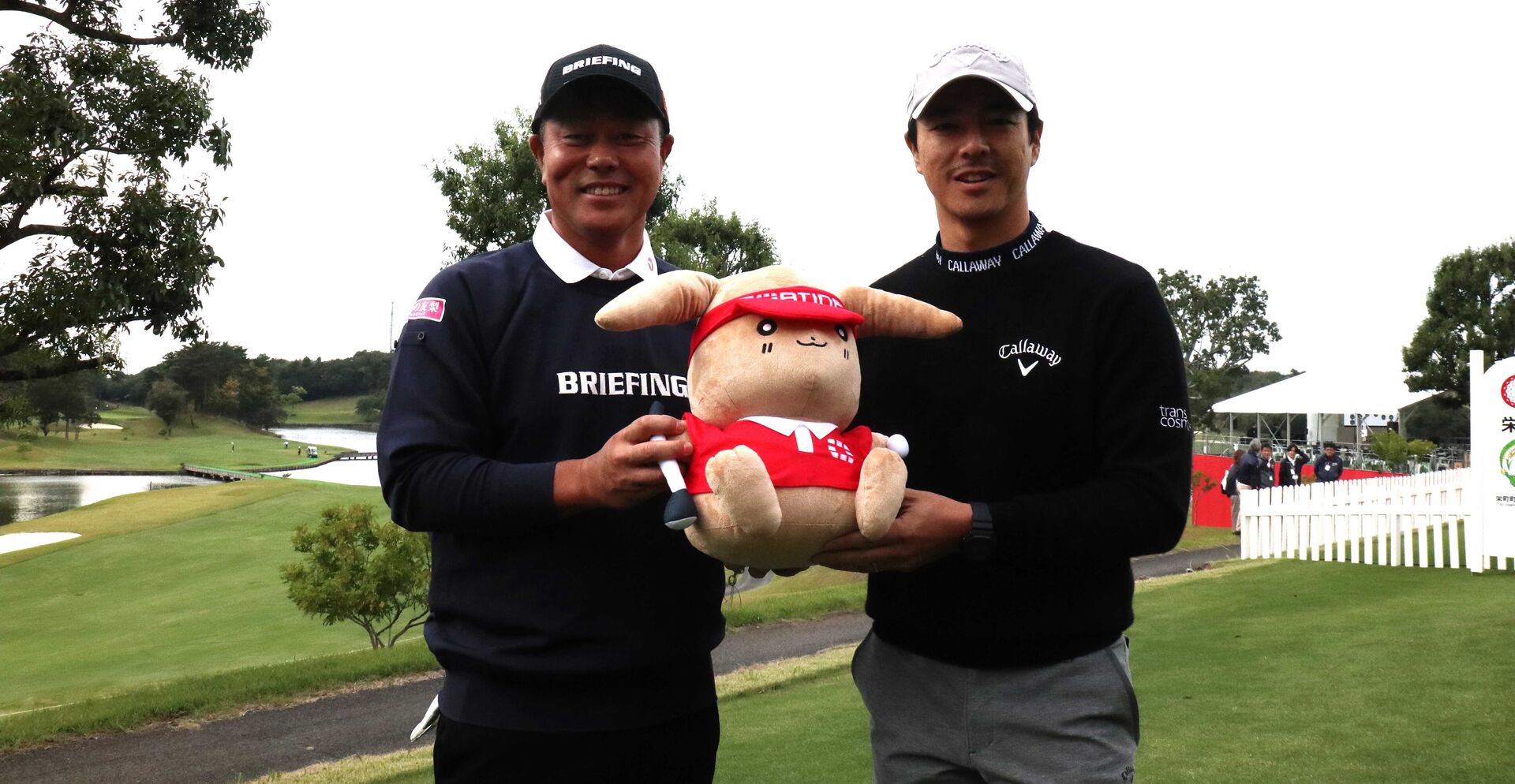 選手会長で、大会会長の谷原秀人(たにはら・ひでと)と、選手会副会長で、同・ファンプロジェクト委員の石川遼(いしかわ・りょう)に抱っこされているのは、サイバーセキュリティの世界最大手「フォーティネットジャパン合同会社」のマスコット「フォーティくん」。