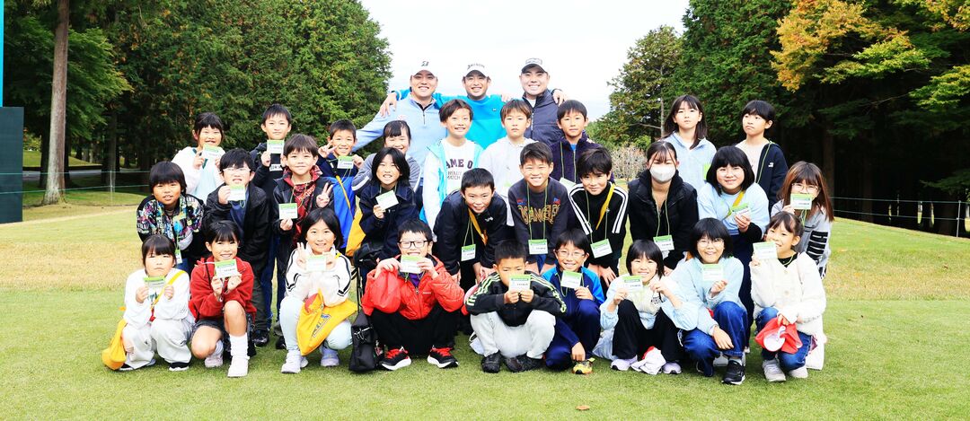 みんなで帽子にサインをもらい、ティーイングエリアの真後ろに置かれたキッズ観戦ベンチに座って、誰より近くで迫力のショットを見守りました。