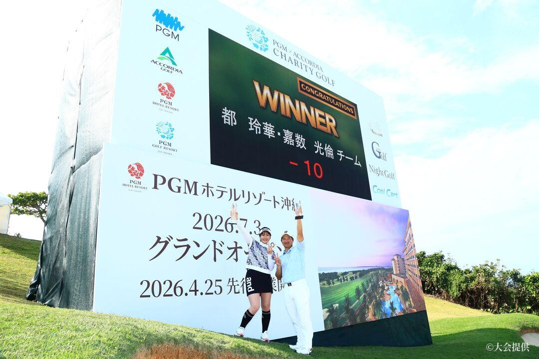 男女トッププロ24組によるペアマッチ「PGM×ACCORDIA チャリティゴルフ」が2月28日、沖縄県恩納村の「PGMゴルフリゾート沖縄」で行われ、都 玲華プロと嘉数光倫(かかず・てるみち)ペアが優勝を飾った。