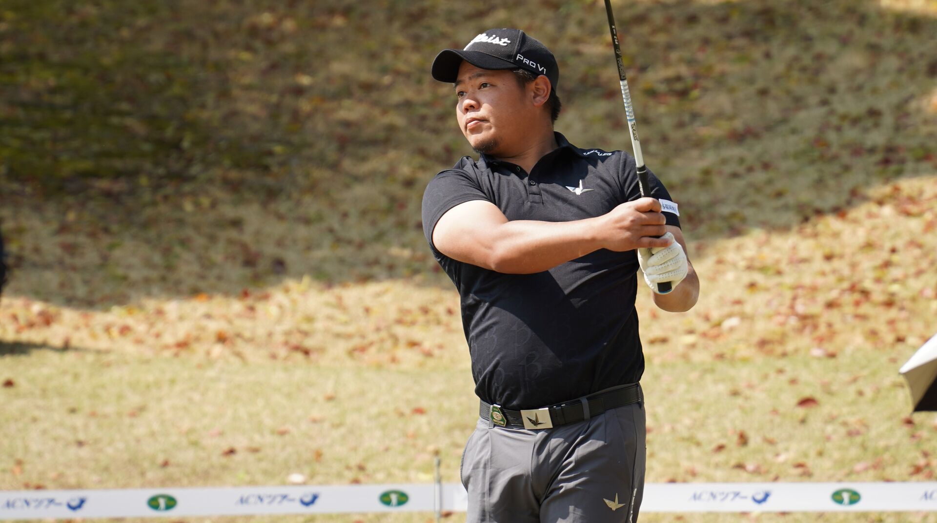 照屋佑唯智(てるや・ゆういち)は、風が吹く中、前半7番から3連続バーディを奪うなど、順調にスコアを伸ばして後半16番では、ついに単独トップに立った。