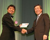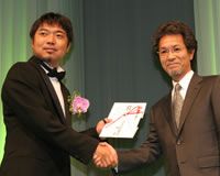MIP賞には記念のトロフィーと、株式会社デサントの代表取締役社長の田尻邦夫さまより副賞の「ミラ・ショーン スーツお仕立て券」を(=写真上)、