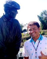 さらに食事を挟み、軽めの打撃練習で調整したあと会場を引き上げる直前に、自身のブログ用にとコース名物、ベン・ホーガン像と記念撮影におさまってこの笑顔……!!