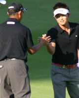 終盤の17番パー3では3mのバーディパットを谷口が沈めた。「竜二がガッツポーズ見たいって言うから17番で見せてあげました。」と話すと今田は「谷口さんの“生”ガッツポーズ初めて見せてもらいました。生で見れて嬉しかったです。」と終盤で盛り上がったチーム・ジャパンは最終18番ホールでフェアウエイど真ん中へティショットを運んだ今田はピン約2mにピタリ。谷口の生ガッツポーズを見せてもらい、力をもらった今田はど真ん中からバーディを沈めトータル14アンダー6位タイでフィニッシュ。「途中谷口さんが話していたんですが、17、18取れたらチョウ・チョウ最低な一日から、チョウ最低な一日になるなって言われてました。」と今田がなんとか最後に救われた心境を語る。また谷口も「今日は二人でやっと1人前のゴルフができたぐらいしかやれなかった。」と反省。