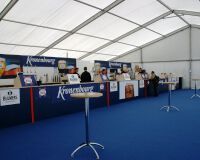 日本のツアーではトーナメント会場にギャラリーの方が飲食できるギャラリープラザというものがある。ここ全英オープンでもギャラリー飲食ブースをはじめマーク入りの記念商品を扱う大型テントなどさまざまなブースがある。その中でも日本ではあまり見かけることがないのが多数のアルコール類を扱うバーカウンター。掲載の写真のように30メートル以上はある長いバーカウンターの中には、スコッチ、バーボン、ブランデー、コニャック等々のボトルが逆さまに吊られている。
