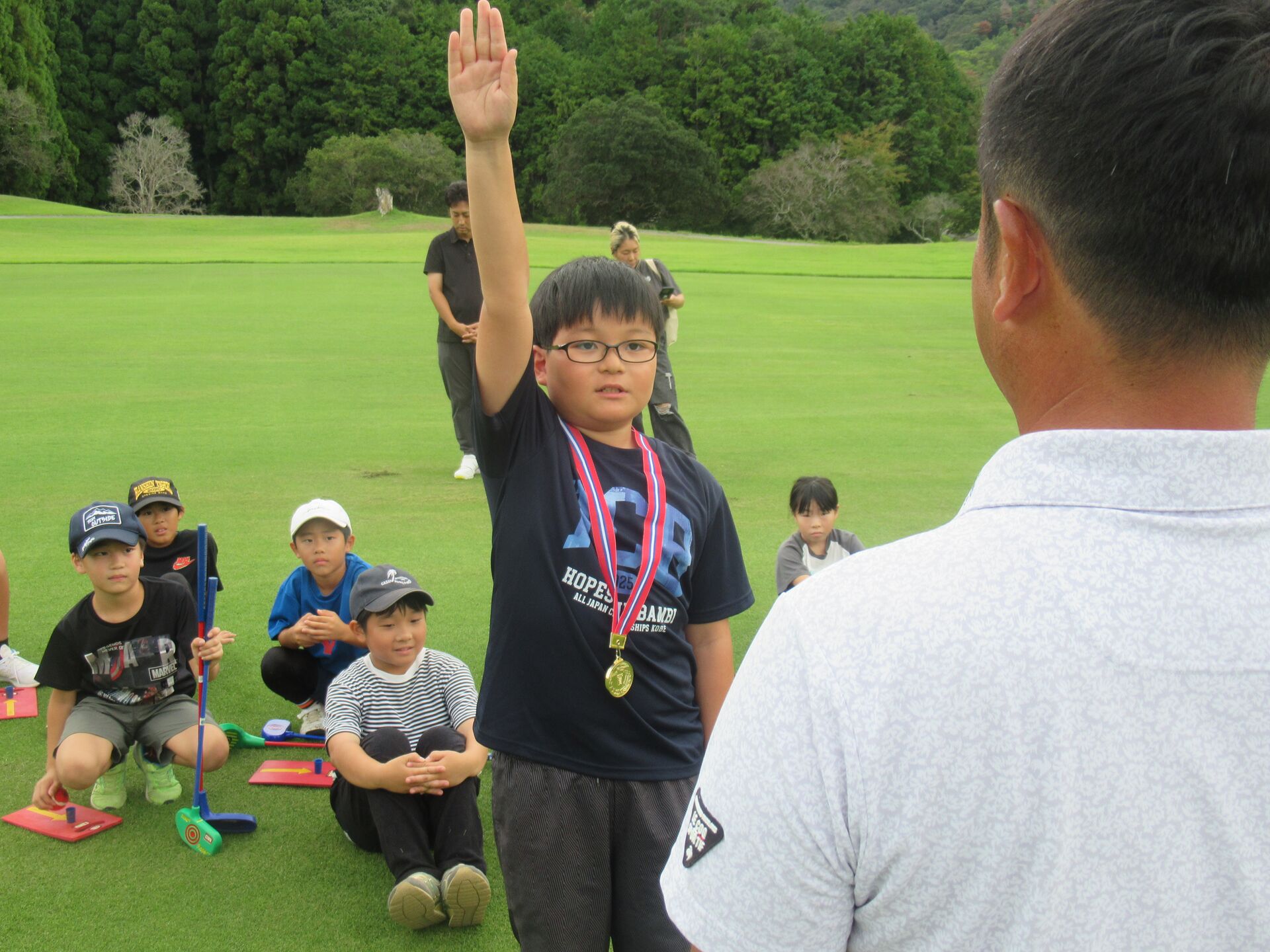 競技は、暖流コース1番ホールの特設コースで競われ、アンジュレーションがあり、早いグリーンに苦戦する選手が多い中、個人戦は、香我美小学校4年生、山崎太哉さんが2位に1打差をつけて優勝、4代目の総合優勝者となった。