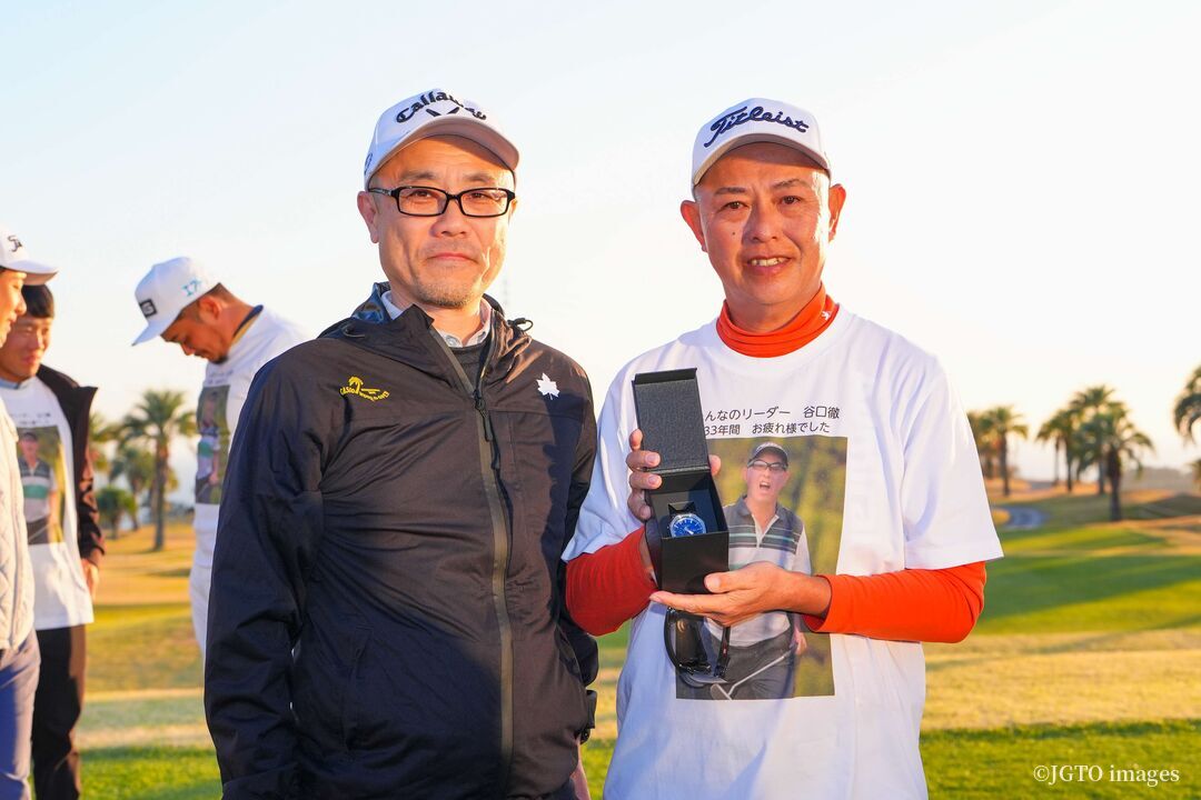 幾人かの選手は、トレードマークのガッツポーズ写真をプリントした上に、「みんなのリーダー谷口徹 33年間お疲れ様でした」と記したオリジナルTシャツを着て待ち構えており、谷口も着せかけられみんなで集合写真をパシャリ。