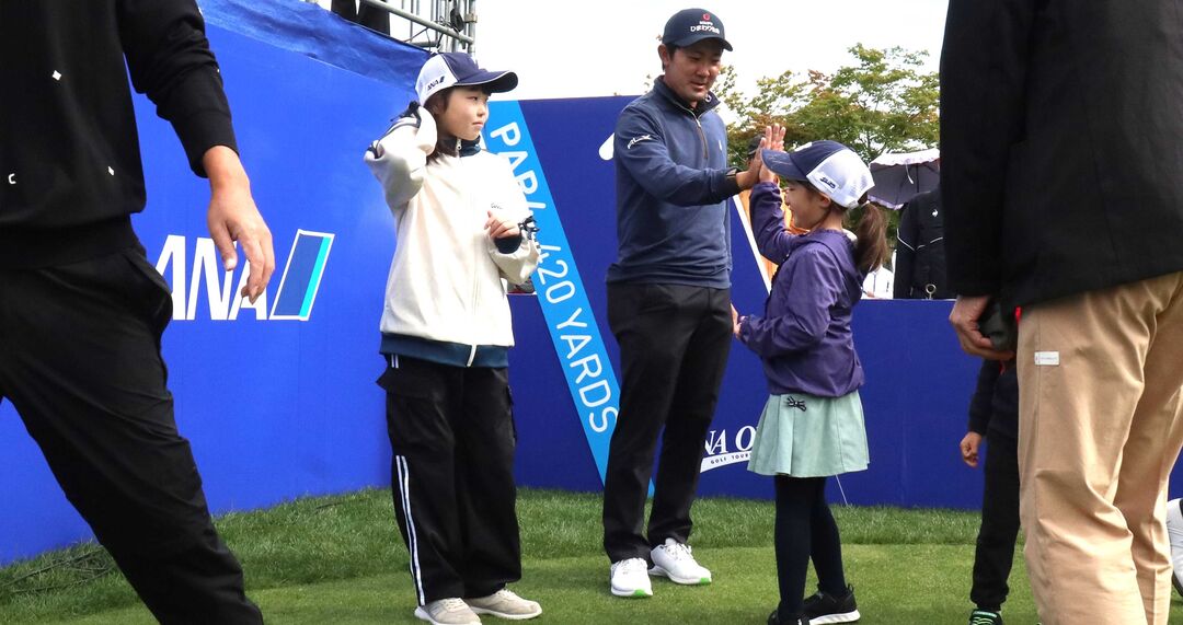 いつもはコースに出ると、途端に表情を鋭くする金谷が、スタート直前の地元キッズとの入場式で腰をかがめて優しい笑顔を見せ、ボールが木に乗った2番のトラブルさえ穏やかに対応した。