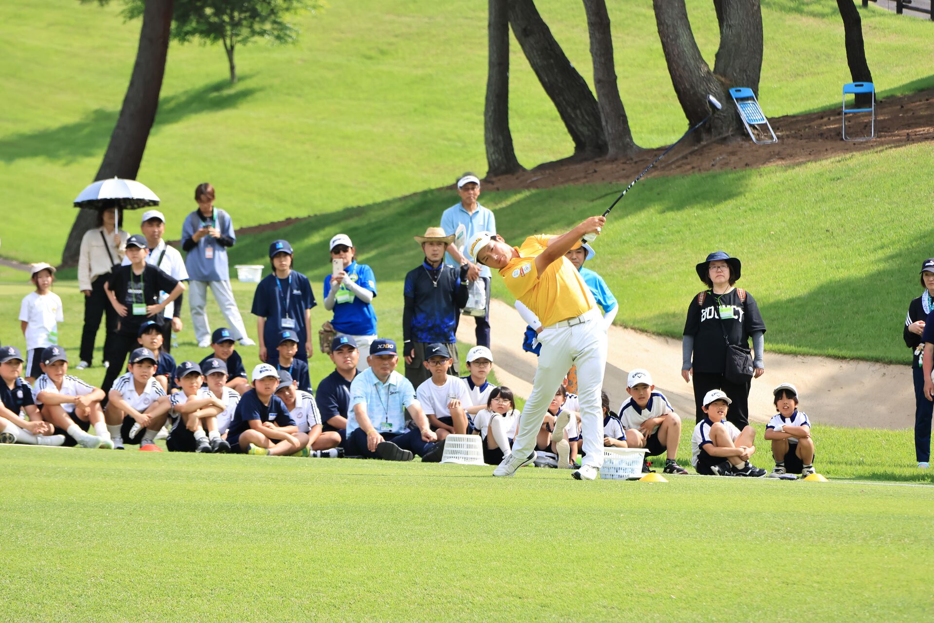 120人の小学生選手を含めた応援約350名からの歓迎の拍手を受けやってくると、ぐるっと囲んだ半円の観客席の中心にレジェンド中嶋常幸の姿が。