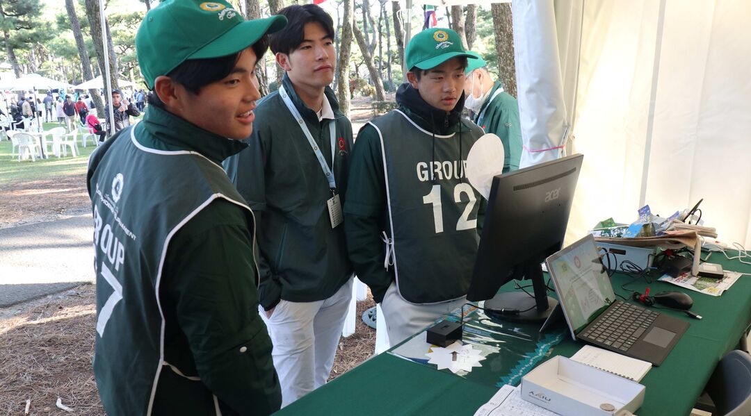 今年も毎日、ボランティアで大会運営をお手伝いしてくれている地元・宮崎県の日章学園高校ゴルフ部の井村大和さんと、木村塁さんと、平尾孝太さんが、各組のスコアボードを運んで歩くお仕事前にぶらり、と立ち寄りいざ、挑戦。