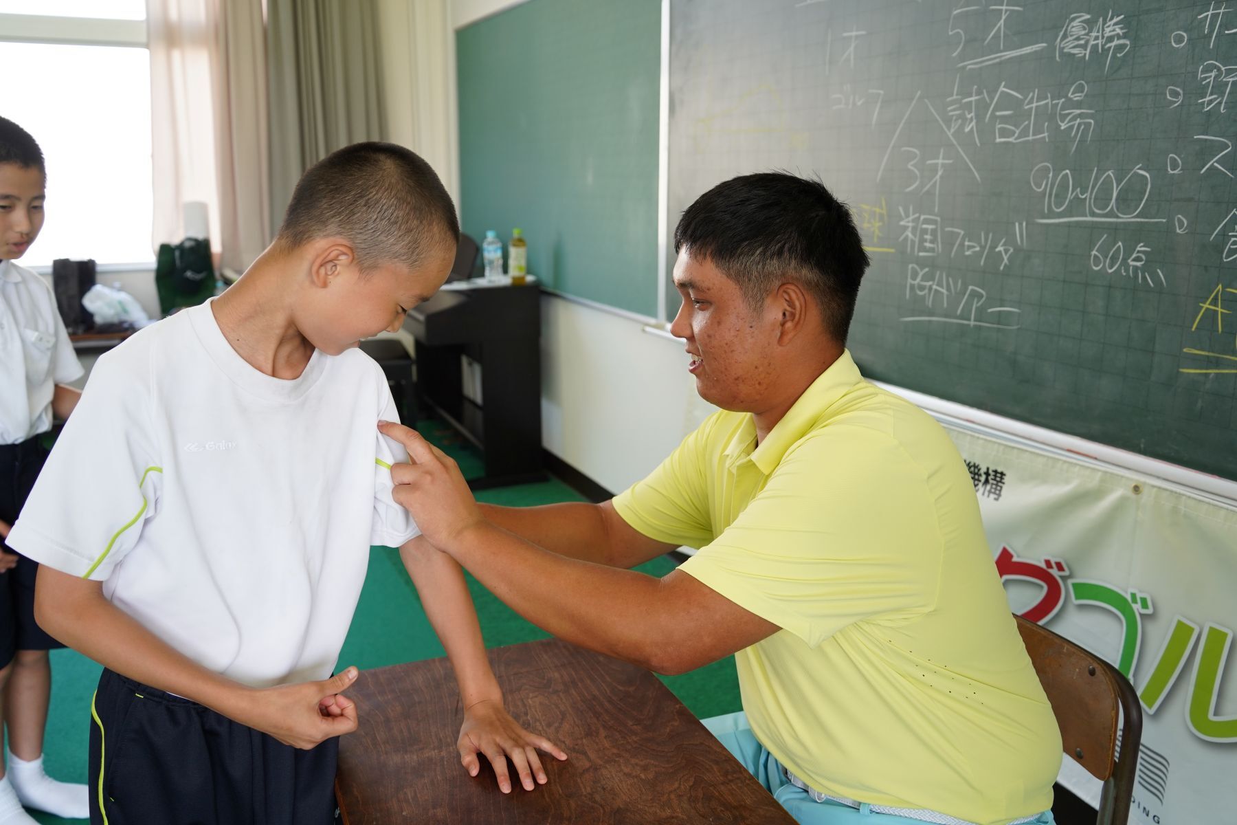 志桜小学校を訪れ芝生で覆われたグラウンド見て「こういうのはいいですよね。転んでもケガしないですし。自然が好きなんです。」と笑みがこぼれる。 講習会を前に追いかけっこやジャングルジムで遊んでいた自分の小学校時代を思い出したようだ。