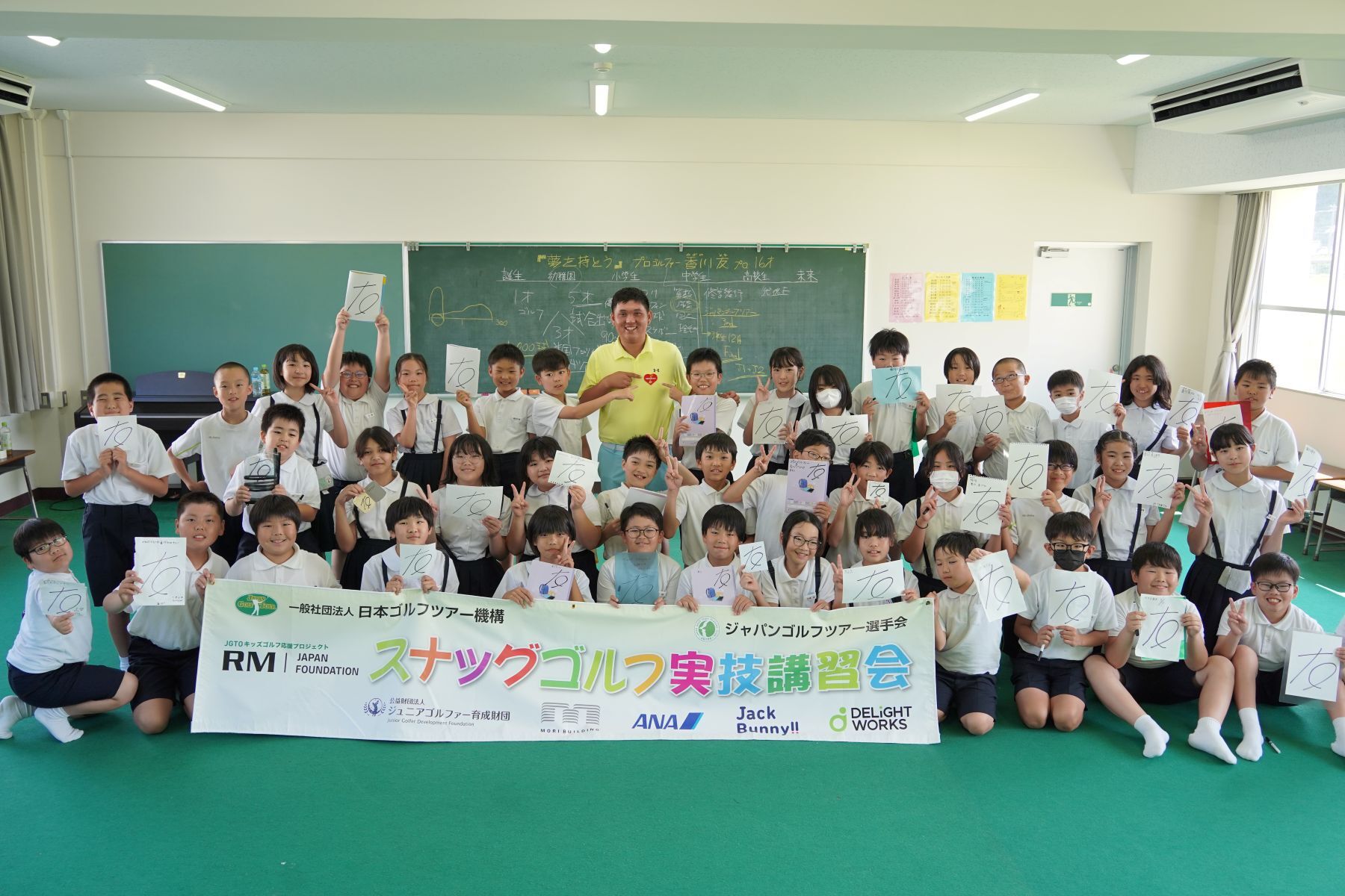 初めて触れたランチャーもすぐ手になじませ、大迫力のフルショットやアプローチなどの小技を次々に披露、子供たちは目をパチパチ、歓声と共に拍手喝さいの大盛り上がりだ。一通りの練習の後、恒例となったガチンコ対決ではじゃんけんを勝ち抜いた松田周磨(まつだしゅうま)くんとの一騎打ち、参加児童の全員が周磨くんを応援し香川にとって完全アウェーで始まった対決は、香川が3打でゴール(カップイン)するも周磨くんは2打のハンデを生かして2打でゴール、見事にプロを打ち破り、スナッグゴルフ講習会はこの日一番の大歓声に包まれた。周磨くんは香川からご褒美のサイン入りキャップをもらって大喜びだ。