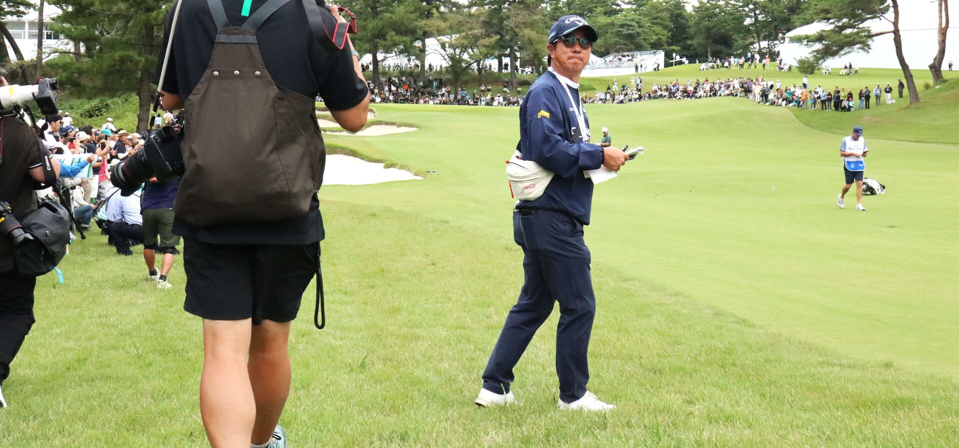 3年後には還暦を迎えるとは思えない若々しさで、記念日のきょうは松山英樹の組を追っかけます。
